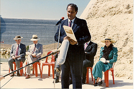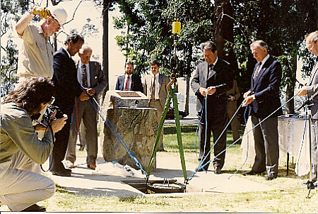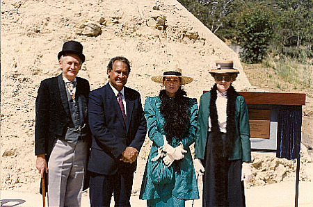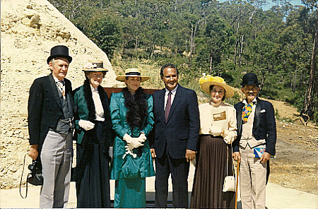 THE OPENING The organising commenced some months before and resulted in Ray Simpson whose wife, Margaret in a descendant of the White family, contacting 150 relatives of the Keane and White Families. That were all invited to celebrate the occasion. The object was to re-enact the original opening held 100 years previously by Mrs. LIlla Keane (nee White), wife of the Mayor Edward Keane. The big coe was that Ray discovered one of the young female descendants was named "Victoria" so it was obvious that she be given the opportunity to officiate at the ceremony. Miss Victoria Williams, the great, great grand-daughter of Lilla Keane proudly accepted the invite. All these invited guests dressed in period costume for the occasion and were presented with souviner medallions. The Opening Ceremony on the 22nd November 1991 was held in two parts. The first was to Commemorate the Centenary of Victoria Reservoir, 1891 - 1991, the second part was the Official opening of the New Victoria Dam following be a re-enactment of the original Victoria Reservoir valve opening in 1891.