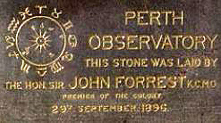 First Perth Observatory] The original Perth Observatory was constructed in 1896 and was officially opened in 1900 by John Forrest, the first Premier of Western Australia. The observatory was located at Mount Eliza overlooking the City of Perth. Its chief roles were keeping Standard Time for Western Australia and Meteorological data collection. In February 1896, William Ernest Cooke was appointed the first Western Australian Government Astronomer after a similar posting at the Adelaide Observatory. He began his new post at temporary quarters in the Legislative Council building and started upgrading the meteorological system initiated in 1867. Meanwhile, plans for the Observatory buildings were being prepared while the site was being surveyed by the officers of the Colonial Architect’s Department. The contract for the main building was let on 2 July 1896 for £6,622.19s, with a completion date of 3 March 1897. The foundation stone was subsequently laid on 29 September 1896.