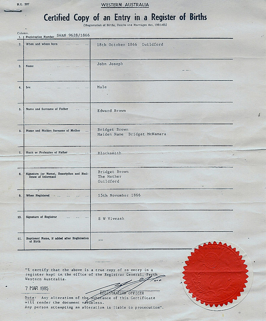 JOHN JOSEPH BROWN'S BIRTH CERTIFICATE #2
