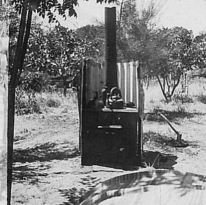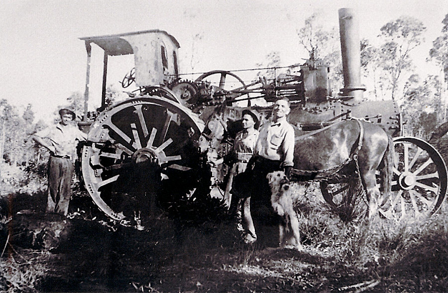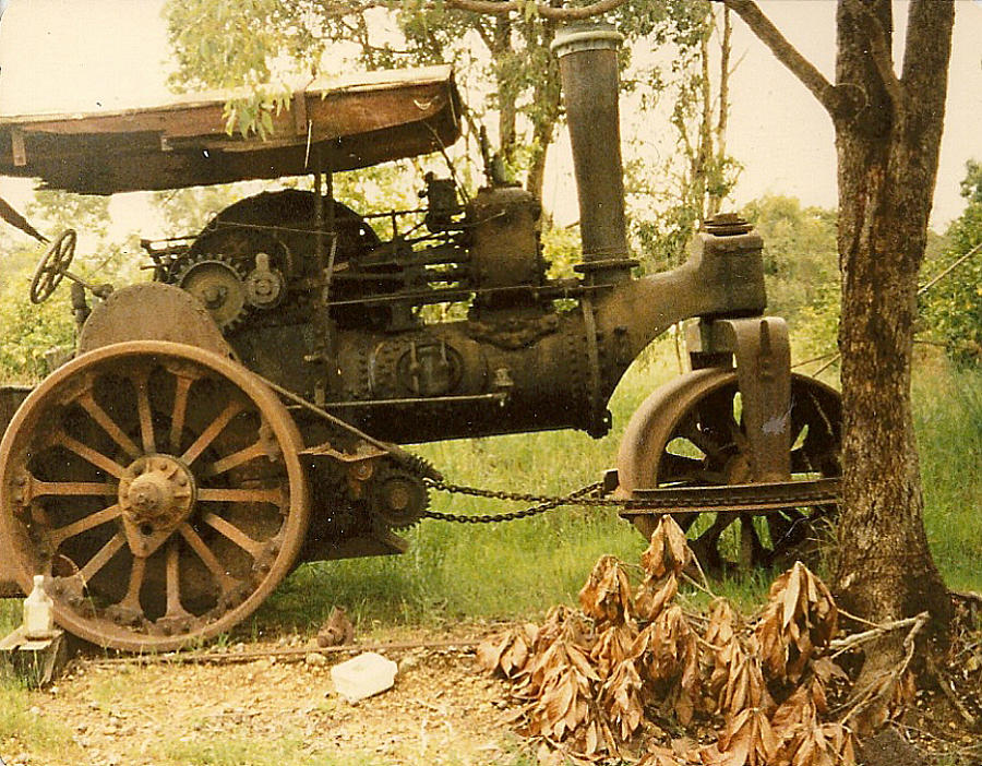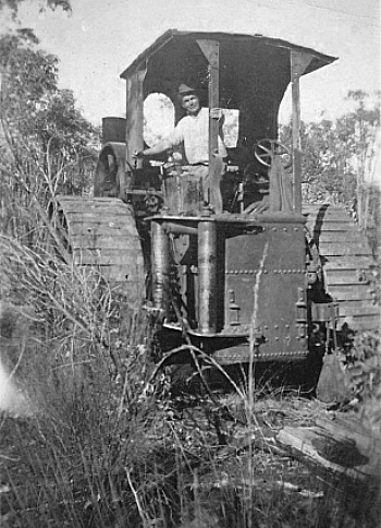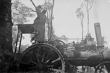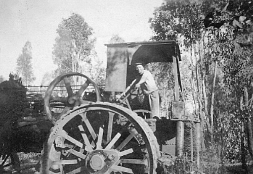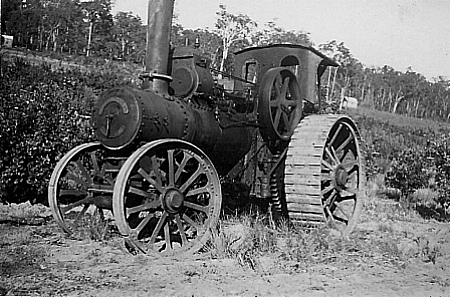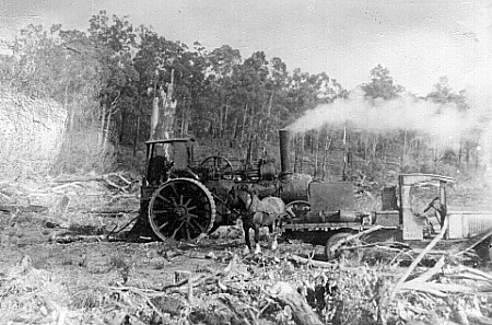 "ARCHIE" ANDERSON #44 They were used for many years pulling trees and for general clearing on many orchard properties. The traction machines easily uprooted trees where bullocks gave up in frustration. Many huge tree stumps had been left behind after the mills had logged the areas and these were very difficult to remove. As no bulldozers were around at this time, the options to remove these stumps were to dig them out, which took ages, or blow them up with dynamite. But the best option, was Archie's very powerful traction engine, which wrapped a steel cable around the stump and then, with full power applied, gently pulled the stump out of the ground. During the days when land was cleared by the steam traction engines there was a long process. Before clearing, "Dolly" the horse was used to drag the heavy metal cables out and around the trees and back to the steam puller. Once this was done, the cable had to be raised towards the top of the tree at the far end. Then the slack was taken up by the engine, once done, the engine starts the hard work by pulling the cable through the bush. The cable which is high up on the trees, is pulled through the bush which uproots all the trees in its path. This was actually quicker than cutting the trees down. The steam traction engine did not have any brakes so therefore, it was parked against a tree which would stop the engine. |