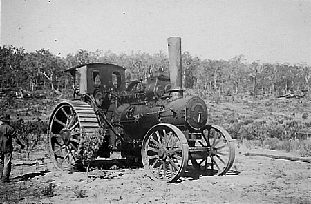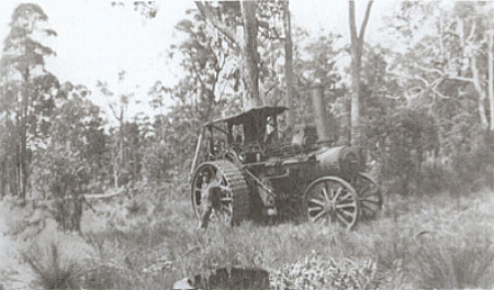 In 1921, the Western Australian Government purchased six new Fowler Big Lion "B6" stump pulling steam traction engines, that had mainly for use in Group Settlement Scheme properties in the south-west. Each machine weighed 16,326kg and had a top speed of 14km/hour and had an 18hp engine. The first Fowler Traction Steam Engine that Archie bought, was one of two been unloaded in pieces, in Fremantle in 1921. The wave of post-World War 1 migration made it necessary to use the 18 horsepower monster to clear land in the Manjimup area for the Group Settlement Scheme. In 1925, it was in the Goldfields, clearing a swath for the Eastern Goldfields Railway. In 1943/44, it was bought by Archie Anderson and used as a tree puller. Arthur's fascination with steam engines tempted him to own one of these steam traction engines. He worked very hard during the war years so he could purchase one. He originally bought one of these steam powered traction engines which he worked in the hills area during the late 1940's and the early 1950's. Archie paid 400 pounds for one of these monster machines. After the war had finished, Archie purchased two more engines and employed ten men. The reason for the steam traction engine being so powerful, is that it uses the two most powerful natural sources of strength - fire and water. This enables it to pull down the most stubborn and the largest tree. It has been known that the front end of the traction engine has been lifted because of a tree, but it would finally pull down the tree. |