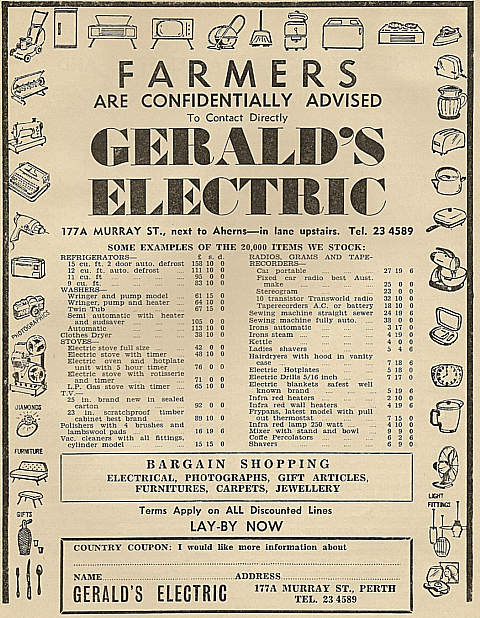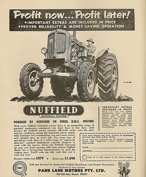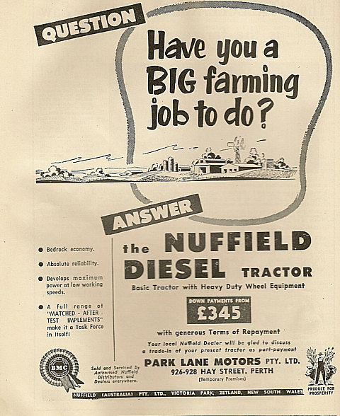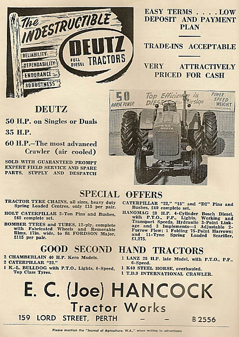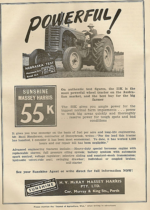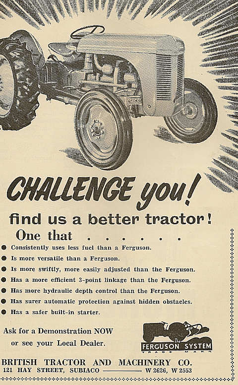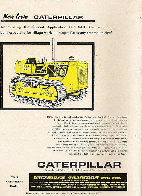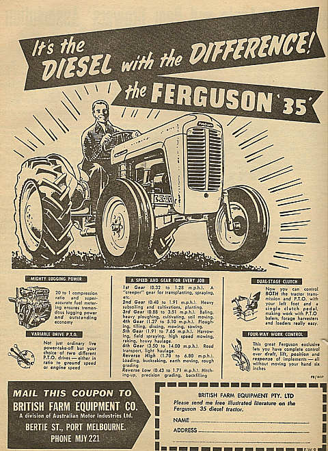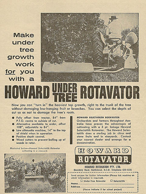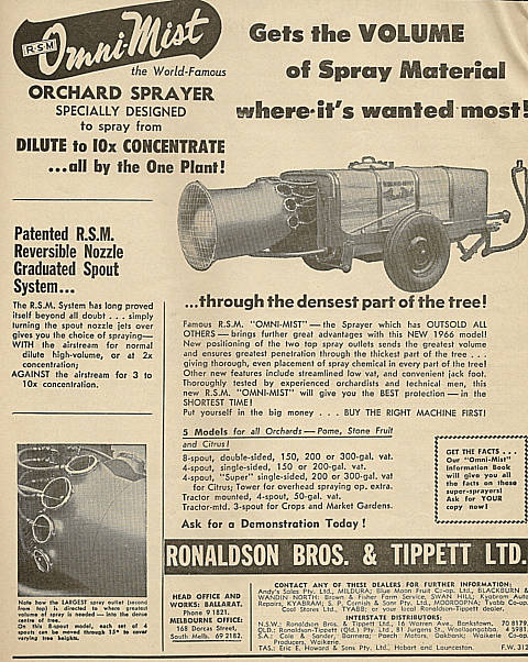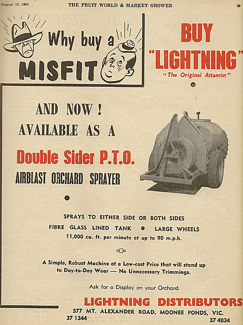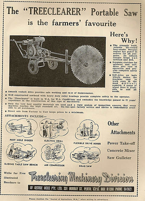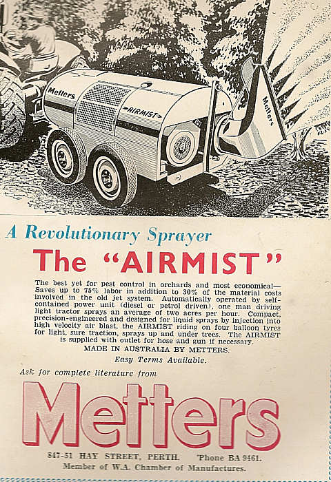 Shown below is a collection of early advertisements taken from published issues of "THE FRUIT WORLD AND MARKET GROWER" 1959 to 1964, "THE JOURNAL OF AGRICULTURE (Western Australia) 1954 to 1967. "Work Safe" would have nightmares looking at the non-existent safety features of some of the equipment, that was available during this period.