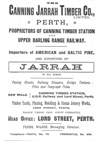 In 1889 Edward Keane took up the timber license that had been granted to Mason and Bird, with the sole right to cut timber on the leased area. The State Government approved the license over the Mason and Bird concession subject to the construction of a railway down the escarpment. Keane and White built the Upper Darling Railway in 1891 to serve the new mill run by the recently incorporated Canning Jarrah Timber Company. This line was built to supply railway sleepers to Perth’s growing railway system. It ran from Midland Junction through to the Darling Ranges and up into Kalamunda, via the Zig Zag section to climb the Darling Scarp. This line was later extended to Pickering Brook and then onto Karragullen. From Pickering Brook the line also ran onto Barton’s Mill, however this was only a logging train. As part of the arrangement with the State Government, Keane’s Zig Zag railway was to carry the public and the general freight of the area. This agreement was to continue in force until the end of 1899, at which time the Government would have the right to purchase the line.