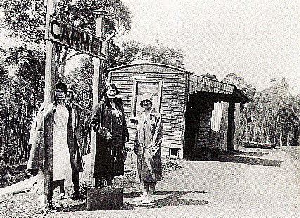 EILEEN POSSELT, IVY REYNOLDS & TWO OTHER CARMEL COLLEGE STUDENTS WAITING FOR A TRAIN AT CARMEL SIDING. NOTE THE TYPICAL SMALL BUILDING #12